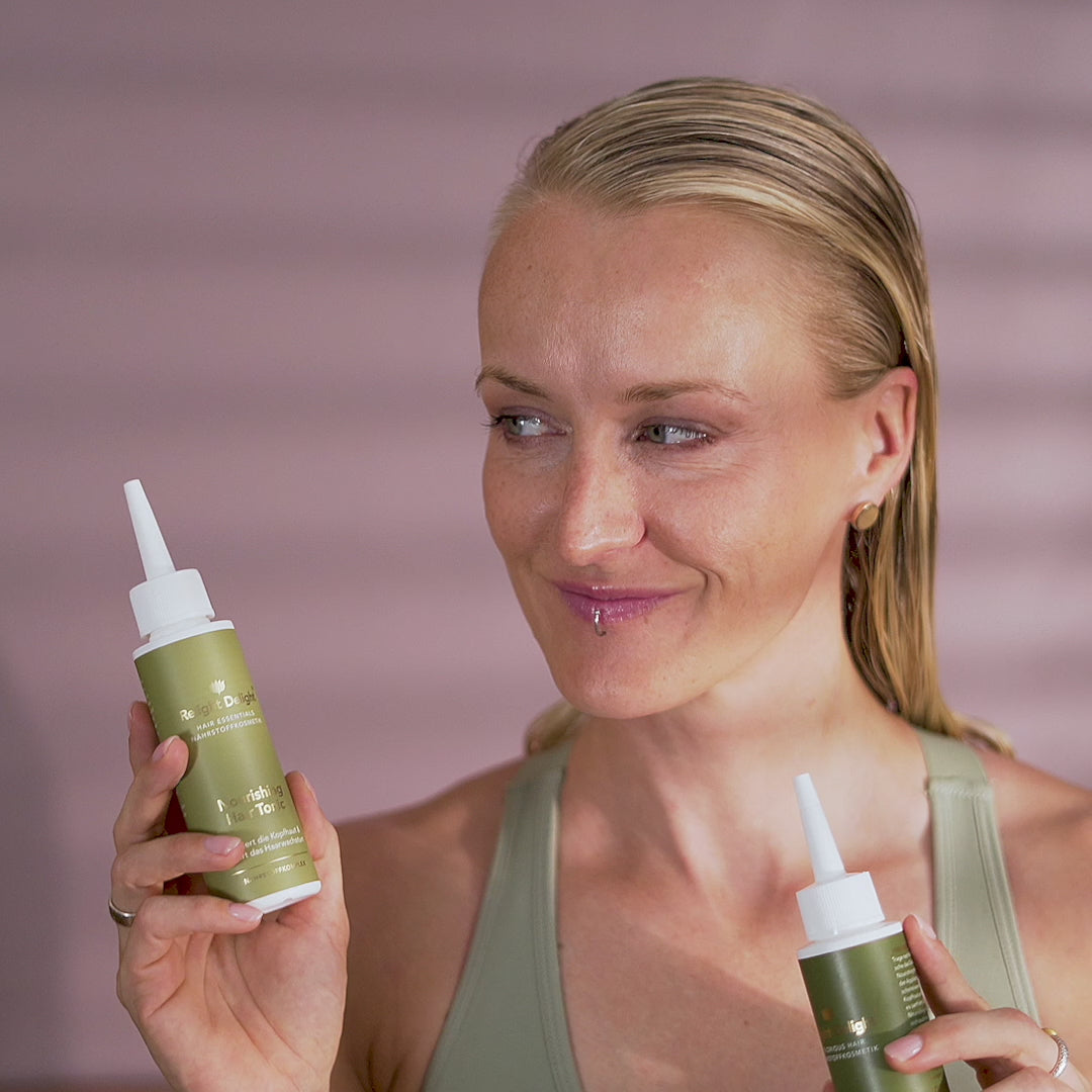 Für extra Glanz: Mische 1-2 Pumpstöße der Hair Repair Cream und ein paar Spritzer des Nourishing Hair Tonics ins Shampoo. So versorgst du dein Haar direkt während der Wäsche mit wichtigen Nährstoffen – für geschmeidiges, glänzendes Haar.